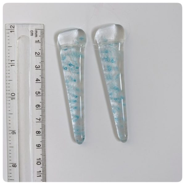Each icicle is handmade so the size will vary slightly but they are approx 9-10cm long and 2-3cm wide (at the widest point).