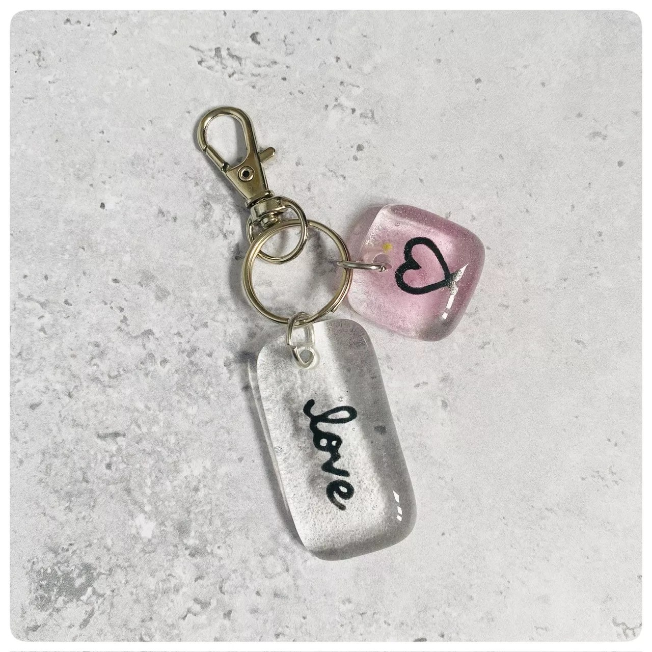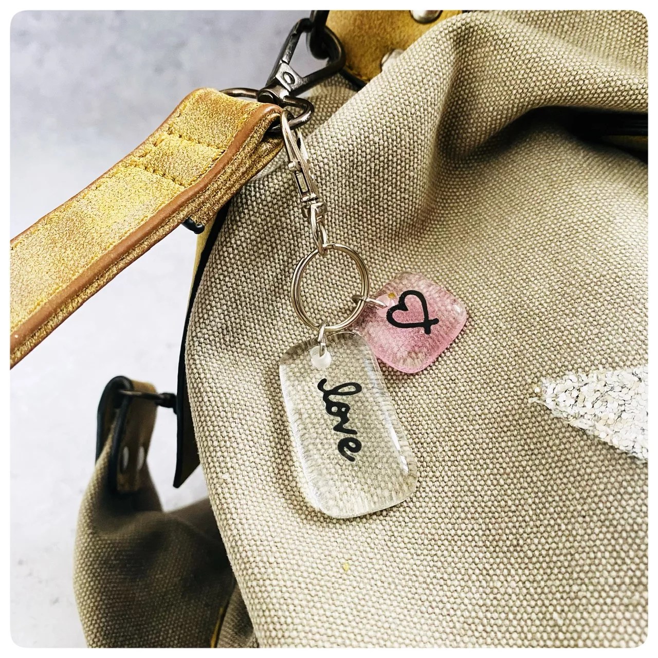 My glass Love keyring includes an inscribed ‘Love’ pebble and pink heart pebble. Crafted with love and attention to detail, this keyring is a symbol of affection. The ‘Love’ pebble carries a heartfelt message, while the pink heart pebble represents love and compassion.