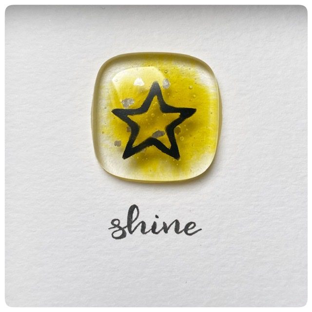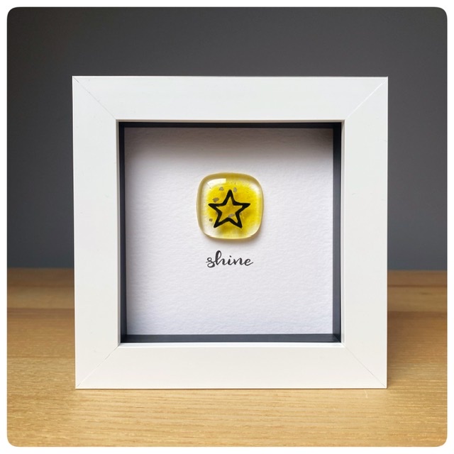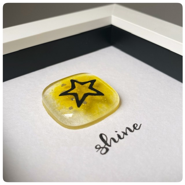 A shine picture frame with and yellow fused glass star and the word ‘shine’ hand written beneath.